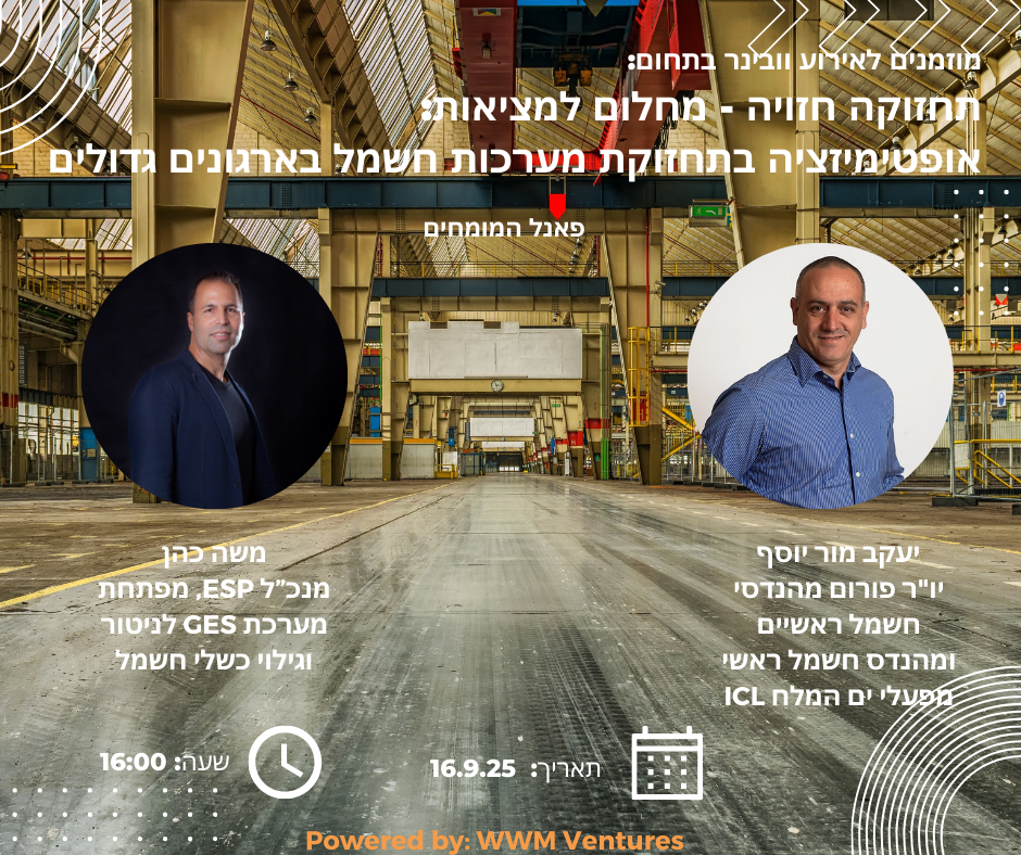 אחד האתגרים המשמעותיים בתחזוקה ותפעול של מערכות חשמל בארגונים גדולים מחד ובמערכות קריטיות מאידך, הוא לייצר אופטימיזציה בתהליכי התחזוקה. כולם מדברים היום על מעבר ל"תחזוקה חזויה". איך מתבצע המעבר בפועל? איך ניתן לגלות תקלות בשלבים מוקדמים מאוד עוד לפני שיש כשלים במערכות? כללי "עשה ואל תעשה" כשמדובר על תחזוקה בארגונים גדולים מוזמנים ללמוד ממומחי התעשיה אודות השיטות, הכלים והידע הדרוש בתחזוקה ותפעול נכונים של מערכות החשמל בארגון גדול, אל תפספסו מתי: יום שלישי 16.9.25 שעה: 16:00 *** האירוע אינו כרוך בתשלום אך מספר המקומות מוגבל :הרשמה לוובינר בתחתית העמוד